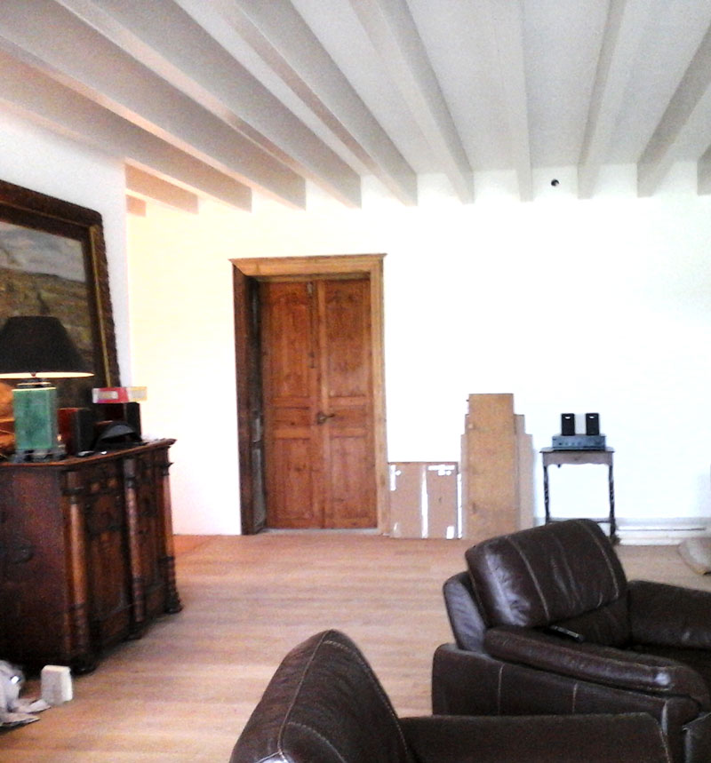 Le propriétaire de cette maison du XVII° entièrement restaurée avait acheté cette double porte du 19° chez Labrouche antiquaire de matériaux Il m'a demandé de la poser et de l'adapter dans le mur. Il s'est avéré après décapage que les bois étaient de plusieurs essences (chêne et sapin), je reprendrai les teintes du bois pour obtenir un ensemble plus homogène, tout en conservant des variations dans la couleur des bois pour garder l'aspect ancien recherché.